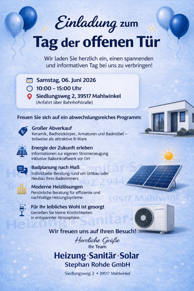 Die Stephan Rohde GmbH, gegründet 1986 von Bernd Rohde, ist ein familiengeführter SHK-Meisterbetrieb aus Mahlwinkel. Seit 2008 führt Stephan Rohde das Unternehmen, das 2021 zur GmbH umgewandelt wurde. Mit rund 15 Mitarbeitern, darunter zwei Bürokräfte, drei Auszubildenden und zehn Monteuren, bieten wir zuverlässige und moderne Lösungen in den Bereichen Sanitär, Heizung und Klimatechnik.